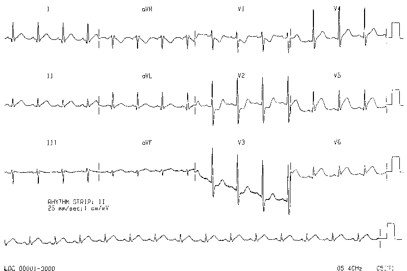 - (fully evolved) tall R wave, tall upright T wave in leads V1 -3